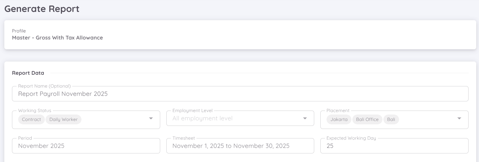 However, if an additional report is required for the same period (for example, when separating reports for daily workers and contract employees), you can contact the Sentec EMS Support Team to request access for creating more than one report within the same period.